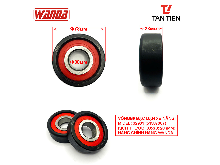 Vòng bi xe nâng 32901 (51507007) là dòng vòng bi chuyên dụng, được sử dụng phổ biến trên hệ thống khung càng xe nâng Tailift tải trọng 1.5 tấn – 1.8 tấn, áp dụng cho cả xe nâng chạy dầu và xe nâng điện. Sản phẩm do hãng xe nâng Wanda sản xuất, đảm bảo độ chính xác và độ bền cao trong môi trường làm việc liên tục.